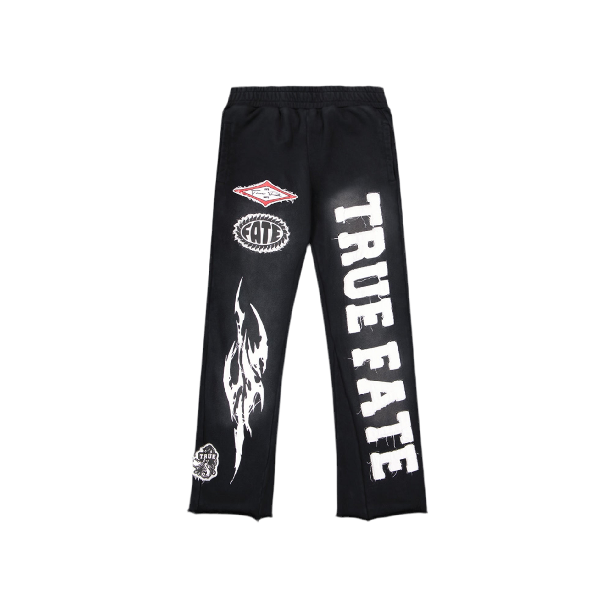 - Distressed embroidered "TRUE FATE" running down the leg
